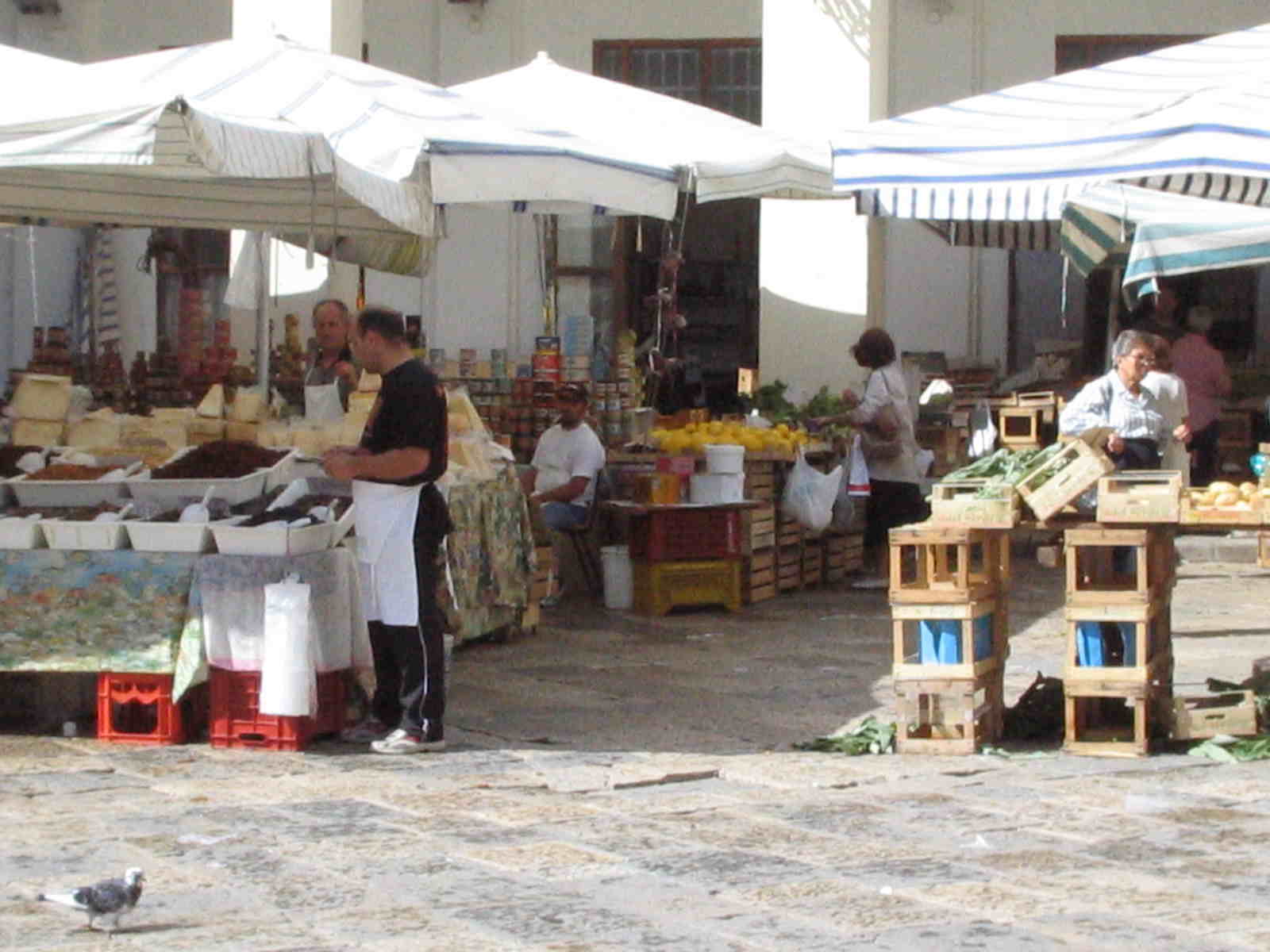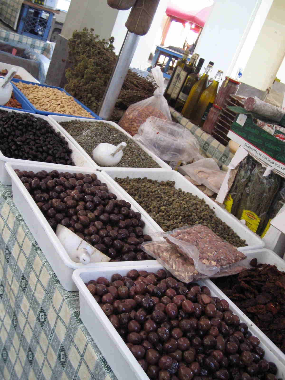 市場にはいろいろな食材も。左はオリーブやカッペリ(ケイパーの塩漬け)