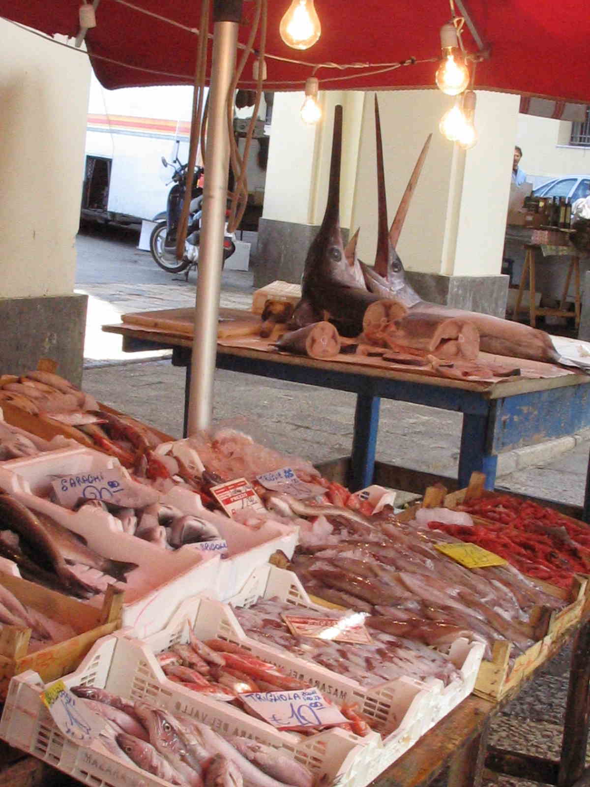 ここは魚市場。奥にお頭付のかじきが見えます。