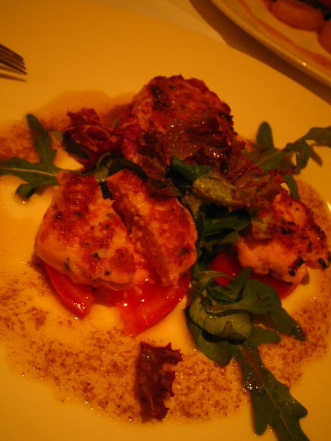 前菜にはサーモンのパンケーキに焦がしバターのソースが。