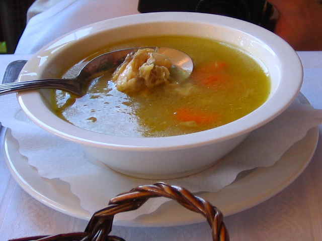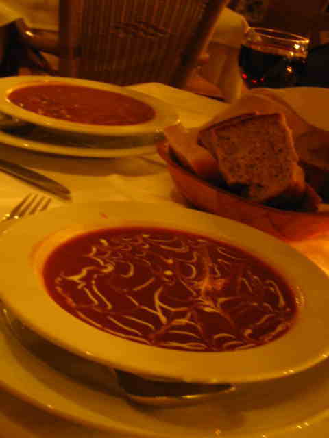 ザゴリエ風スープ(ベーコン、野菜、キノコをパプリカで煮込んだ田舎風スープ)と
