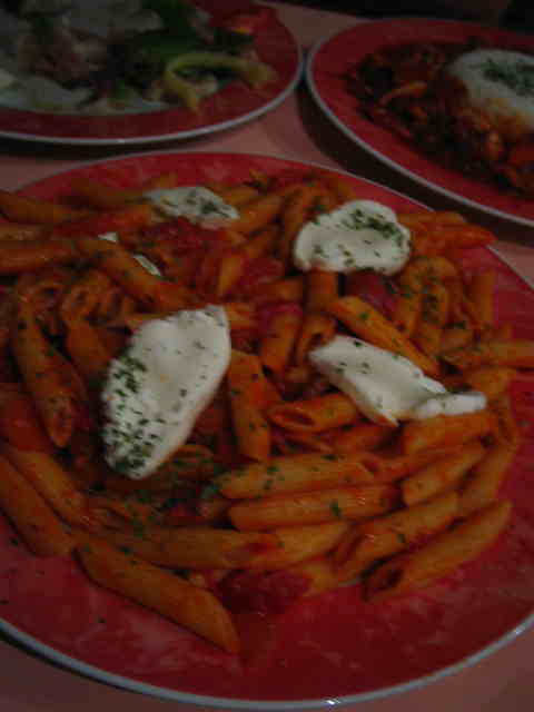 トマトソースのペンネにモッツァレラがのっています。