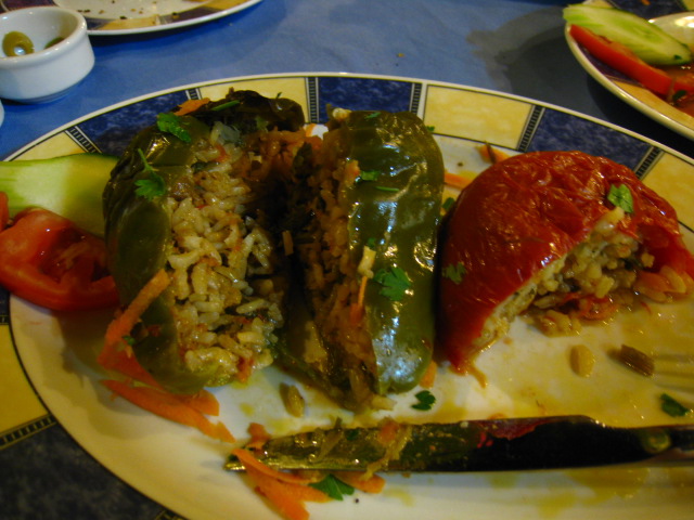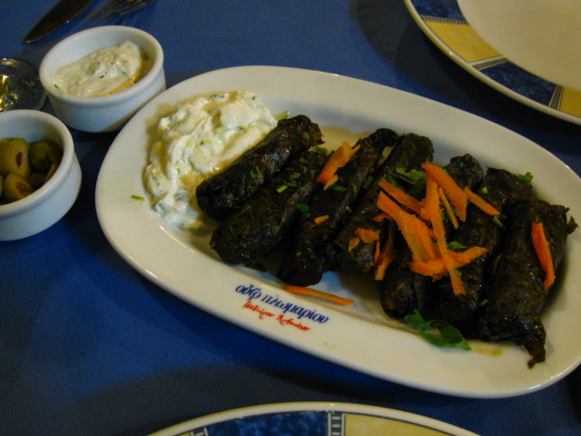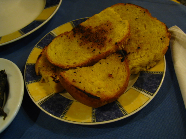 ぶどうの葉(塩漬けになっていた?)にひき肉、米などの具をくるんだドルマーデス。おともにガーリックトーストがおすすめ。