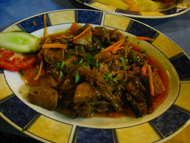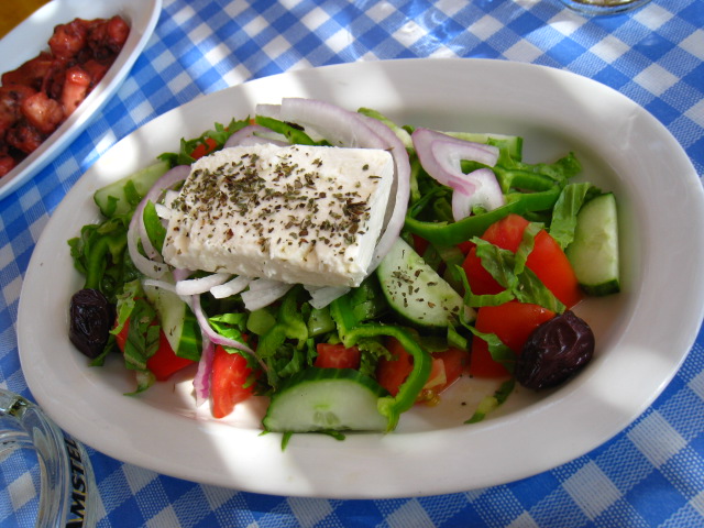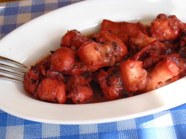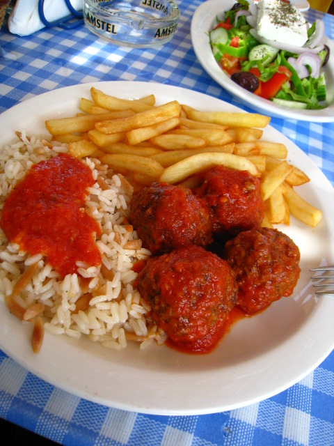 ギリシャではよく見られるミートボールの煮込み。なんでもフレンチフライがついている〜