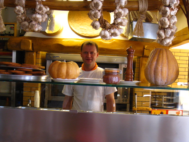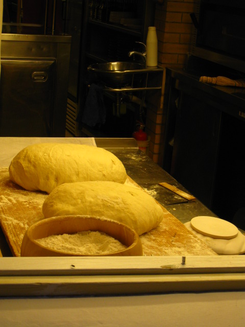 ガラスの向こうでおにーさんがピザの生地を伸ばしてます!