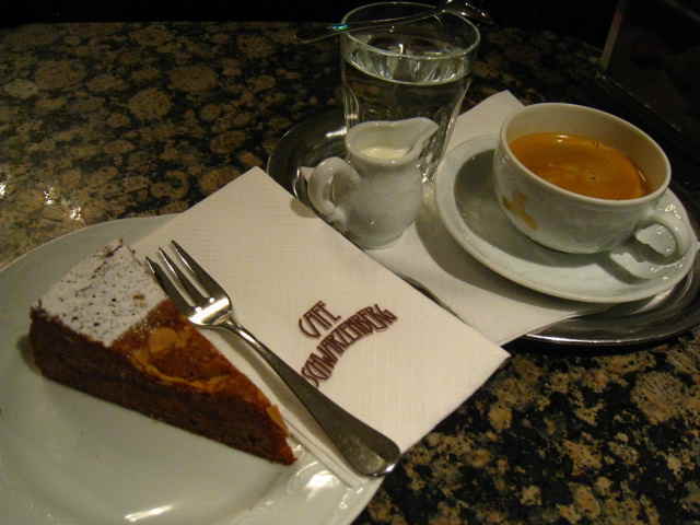 ケーキにメランジェ(クリーム、ミルク入りのコーヒー)じゃ