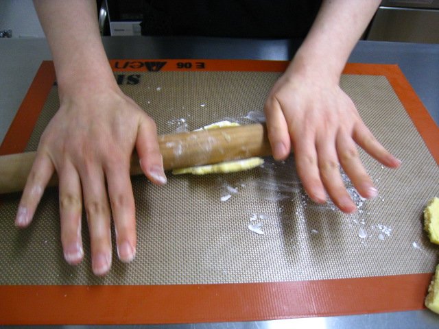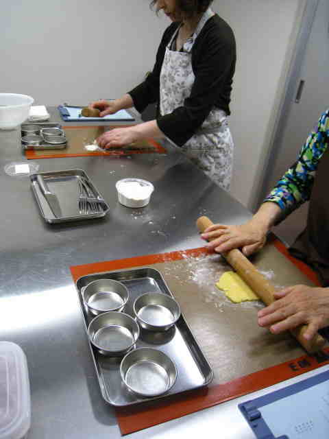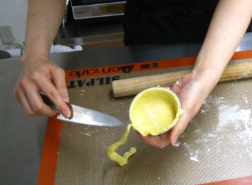 まずはタルト生地(パータシュクレ)を伸ばし、タルトカップに敷きこみます。